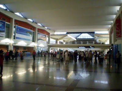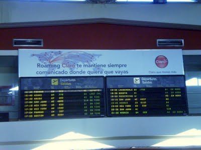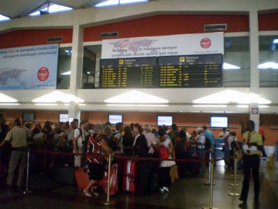 Había una enorme cola para facturar en el mostrador de Pullmantur Air (estábamos todos los que habíamos pasado una semana en República Dominicana, más todo el pasaje del crucero que acababa de terminar ese día, ya que regresaríamos en el mismo vuelo). El avión despegaba a las 19.30h. y no creáis que nos sobró mucho tiempo… Por cierto, en el aeropuerto hay múltiples tiendas «duty free» de buena calidad (igual que en Barajas), donde se pueden hacer las últimas compras (ron a 5€, arte taíno, perfumes, tabaco, etc).