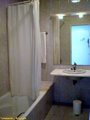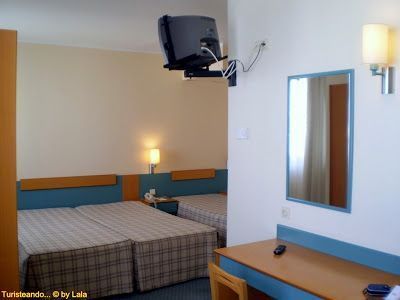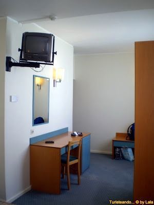Llegamos sobre las 11 de la mañana, y tuvimos que esperar unos 10 minutos para que nos asignaran habitación, pues aún no estaba preparada, pero al final nos dieron una triple (había reservado una doble), supongo que porque fue la primera que les quedó disponible. La habitación, por tanto, era bastante amplia, con tres camas de 90 cm, una buena mesa escritorio, un armario de más o menos un metro, y TV satélite (pequeña, colgada de un soporte en la pared). El mobiliario, sin ser nada del otro mundo, no estaba mal, funcional y en líneas modernas, aunque eché en falta una mini nevera para poder tener al menos una botella de agua fresca, ya que estábamos a 32ºC en la calle.