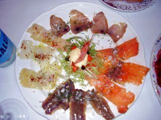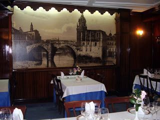 El Restaurante Amboto está especializado en cocina tradicional vasca, especialmente el bacalao y otros pescados y carnes a la brasa. También hay un menú especial de la casa (26€) y hacen menús especiales para grupos. Éramos tres personas, y pedimos dos entrantes (surtido de embutidos y de ahumados) y luego un segundo plato cada uno (rodaballo con gulas y gambas, rape a la plancha con almejas y gambas, y solomillo al queso de Idiazábal), todo ello basado en el apartado de la carta que indicaban como «platos recomendados». El precio, unos 30€ por persona, incluyendo una botella de vino, que creo que es un precio medio normal para Bilbao.