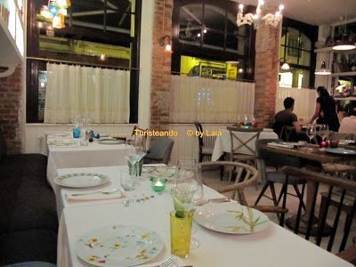 El local no es muy grande y está dividido en dos zonas, una destinada a la vinoteca / bar de tapas, y otra al restaurante como tal. Me pareció estar decorado con muy buen gusto, combinando madera, ladrillo visto, metales, y reutilizando muebles y lámparas antiguas.