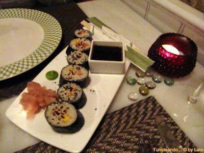 Las raciones son abundantes y tienen una excelente presentación, la verdad es que es todo tan apetecible que cuesta decidirse… Tres raciones son más que suficientes para una cena para dos personas. Anoche pedimos: Sushi (muy logrado), tempura mixta de langostinos y vegetales con infusión de tomate y salsa de soja (bueno, pero me decepcionó un poco), y medallón de foie con salsa de frutos rojos y reducción de módena (realmente espectacular). El «punto flaco» de nuestra cena fue el postre, la torrija caramelizada con chocolate caliente, ya que el chocolate era un mero sirope de bote y estaba frío.