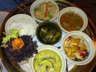 Era la primera vez que iba a un restaurante de cocina tailandesa, así que al no conocer la carta no me compliqué la vida y pedí el típico menú degustación, que me encantó. De primero venían unas brochetas de pollo marinadas, un pequeño rollito de primavera que estaba buenísimo (y eso que los de los chinos no me gustan nada), unos langostinos a la gabardina pero la pasta era de arroz, unas empanadillas rellenas de carne de cerdo que me gustaron menos por la textura un poco gelatinosa. Los segundos venían presentados en una gran fuente con varias cazuelitas: langostinos al curry, tallarines de arroz (estos me encantaron, creo que fue lo que más me gustó), un estofado de buey que para mi gusto estaba muy fuerte, y pollo que venía envuelto en una hoja de tamarindo, todo ello acompañado de arroz blanco que no probé porque no me gusta el arroz en general. Aparte te traen las salsas y te explican con qué debes comerlas.