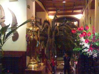 Una vez cruzadas las puertas que hay al final de ese pasadizo la cosa cambia por completo. El local es una pasada, inmenso, con varias alturas y todo lleno de plantas tropicales, orquídeas, fuentes y pequeños estanques. Lo primero que ves al entrar es un gran buda dorado, y todo el personal está vestido con trajes típicos tailandeses. Está distribuido en varios comedores, decorados al estilo colonial, con muebles de teka y todo preparado al más mínimo detalle.